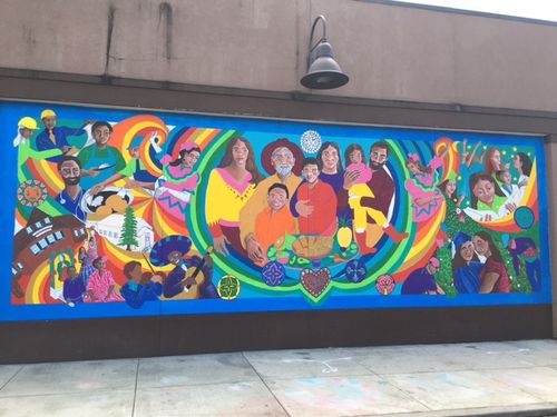 "Over the past two years the Estacada mural collective The Artback has collaborated with the local Latinx community to create the Que Tus Suenos Te Lleven a la Vida Te Haga Feliz mural (Let Your Dreams Guide You to a Happy Life). The artists and community organizers met with churches, non-profits, small business owners, schools, individuals, and families to have conversations about Latinx life in Estacada and ultimately to seek out what the Latinx community wanted represented in a mural about their culture. This process led to many conversations about family, food, faith, entrepreneurship, education, racism, inclusivity, friendships across difference, and the hopes and dreams that lead to a contented life in a community.